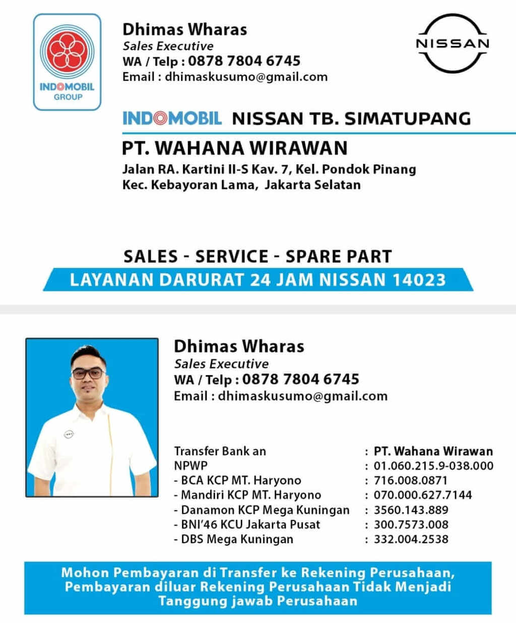 Hallo salam hangat, saya Dhimas sales representative Dealer Resmi Nissan Jakarta. Terima kasih sudah mengunjungi website saya, apabila ada informasi yang anda butuhkan mengenai promo produk terbaru kami, jangan sungkan hubungi saya, layanan Gratis konsultasi kapan saja dimana saja anda mau, baik itu melalui media online, Chat, Call atau Video Call untuk saya tunjukkan langsung kendaraan pilihan anda, tanpa anda pergi dari rumah. Kami juga menyedikan layanan transaksi online terpercaya dan bisa mengantarkan unit test drive ke depan rumah anda, kapanpun anda mau.